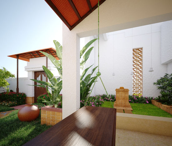 A well thought out and organized front yard design and landscaping should compliment the natural terrain of the land and enhance the general overall theme of your Kerala styled home. This is a landscaping design for Kerala Style villa at Bangalore. If you have small space in front of your house then a small garden with grass and traditional flowering Plants will enhance the space to look closer to the desired style.